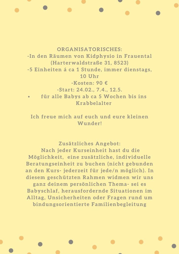 Nach jeder Kurseinheit hast du die Möglichkeit, eine zusätzliche, individuelle Beratungseinheit zu buchen (nicht gebunden an den Kurs- jederzeit für jede/n möglich). In diesem geschützten Rahmen widmen wir uns ganz deinem persönlichen Thema- sei es Babyschlaf, herausfordernde Situationen im Alltag, Unsicherheiten oder Fragen rund um bindungsorientierte Familienbegleitung